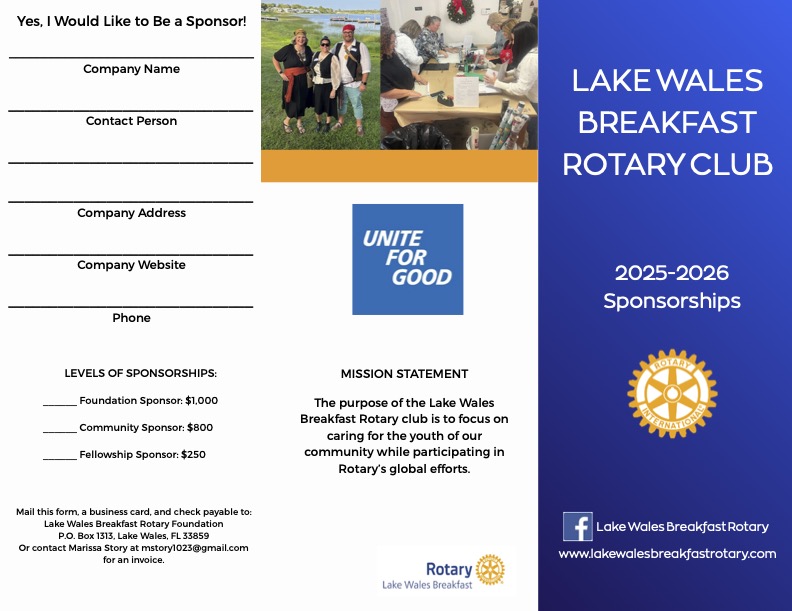 Fellowship Sponsor ($250). Company business card advertisement in any Lake Wales Breakfast Rotary publications and company recognition on our Rotary Facebook page.